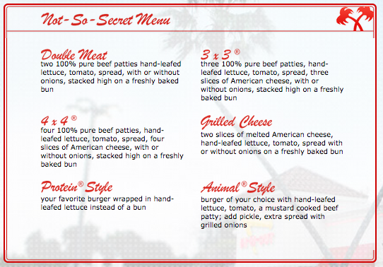 The Top Secret Part I Left out from the Secret Sauce from rocklandpeakperformance.com The menu at in n out reaches far beyond the standard 4 items listed on the menu. Most burgers come with thousand island dressing, cheese, lettuce, tomato. The chain's secret menu is super popular among guests and employees and has been covered by news outlets all over the country. But sheknows has the inside info! Fries well done on the right. Published on 8/19/2015 at 12:05 am. Order a black and white shake and you'll get a cup filled with half chocolate and half vanilla. Ever heard of animal style?